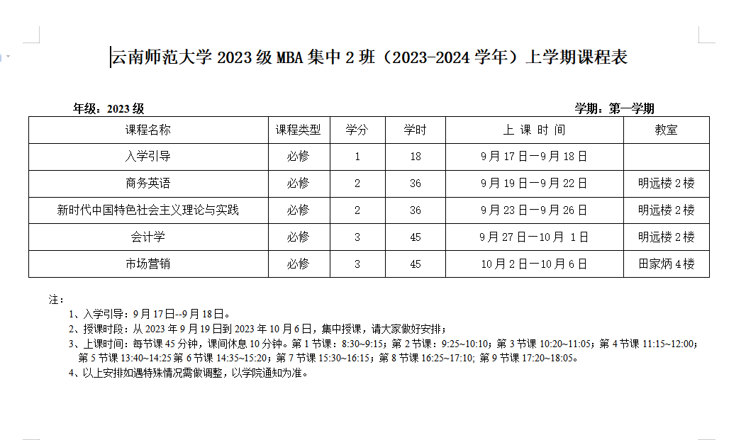 2023级MBA集中班第一学期(2班)课表