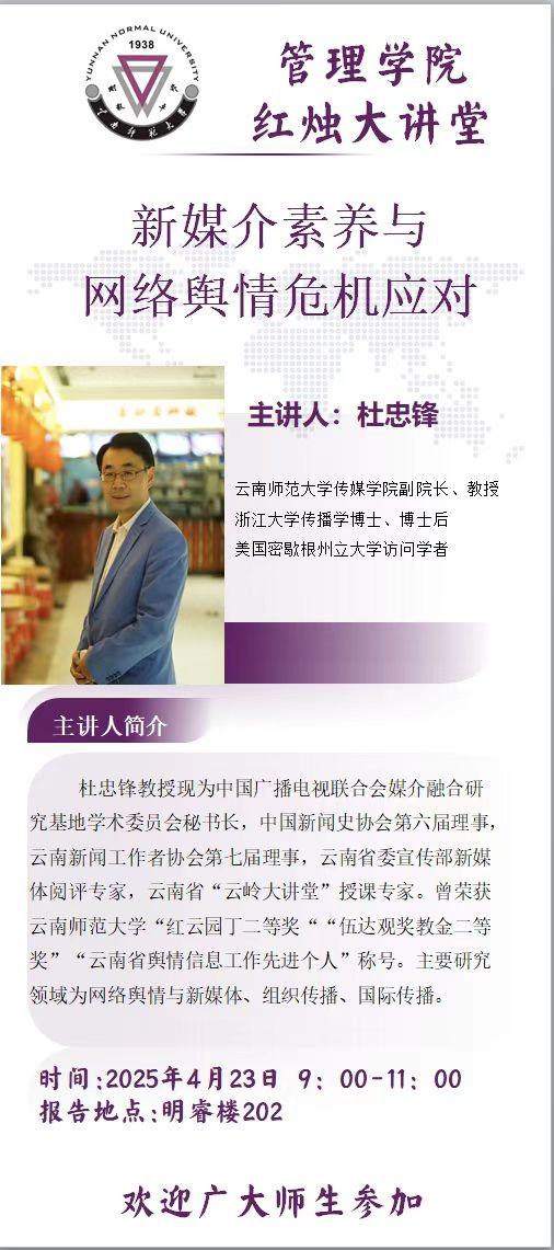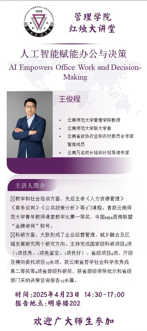 管理学院红烛大讲堂 即将迎来两场精彩讲座!从组织舆情的危机应对到人工智能的实践应用,两位学者将带来深度剖析和前沿洞见。无论你是学术研究者、行业从业者,还是对未来趋势充满好奇的学子,这里都有你不可错过的知识盛宴!
