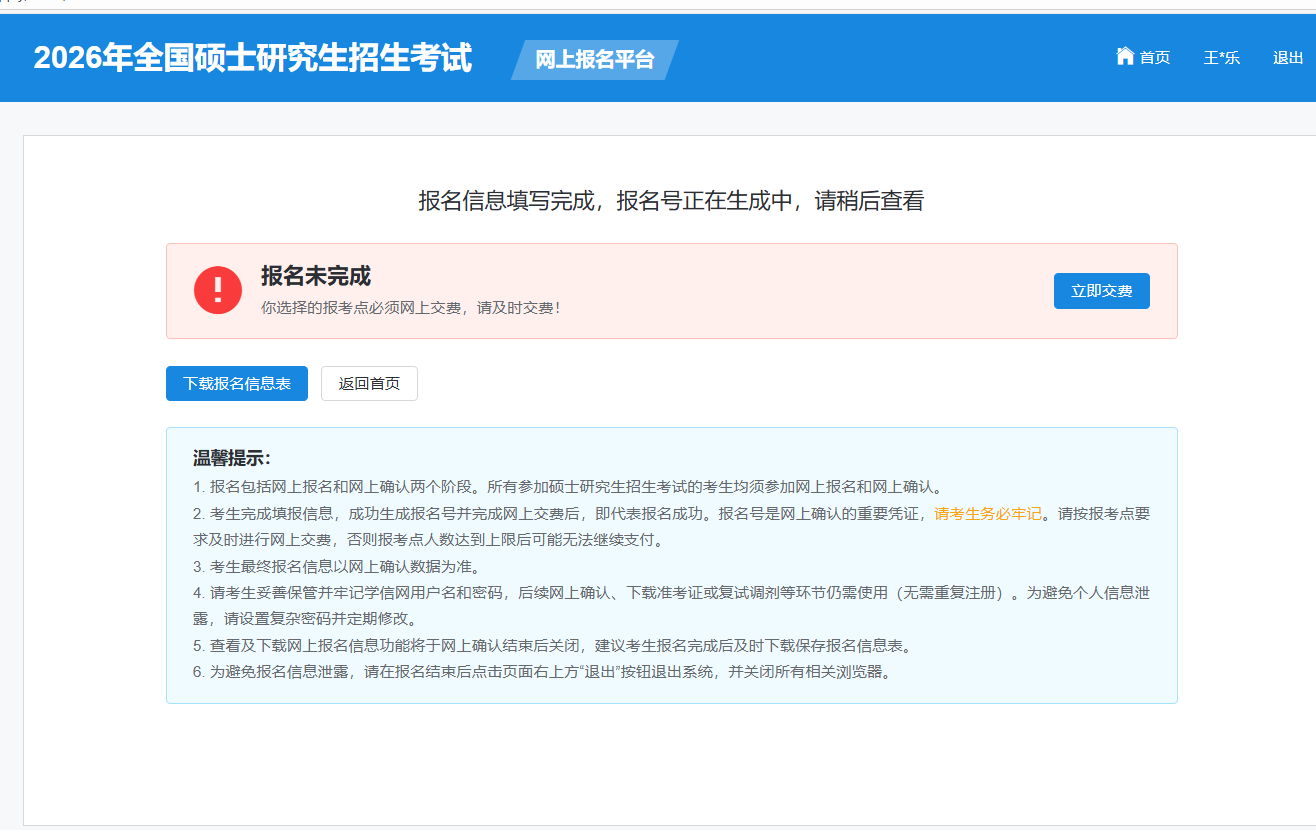 13. 再次确认考生报考信息无误后点击“确认报名”,生成报名号。生成报名号并交费成功后才算报名成功。报名号是网上确认的重要凭证,请考生务必牢记。