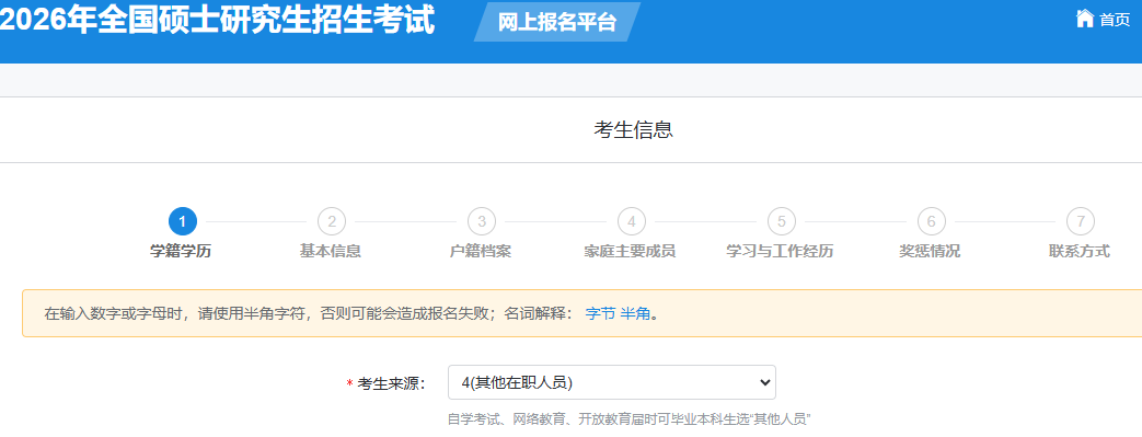 6. 学籍学历信息中“考生来源”一般为“4其他在职人员”。