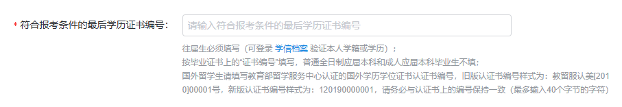 7. 毕业证书编号请填写16位或18位电子注册号或者学校编号,若毕业证书上没有16或18位数字编号,则填写证书上其他数字编号;若有学位证书,请将学位证书编号也填写准确。毕业证书编号若只显示一个编号,则填写该编号;若显示两个编号,则填写“学校编号”项。