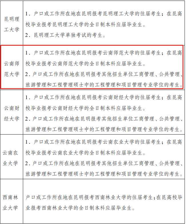 (1) 户口或工作所在地在昆明报考云南师范大学的往届考生;在昆高校毕业报考云南师范大学的全日制本科应届毕业生。