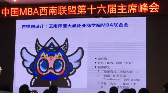 接着,会议发布了中国MBA西南联盟吉祥物“为为”,吉祥物是在西南联盟艺体专委会指导下,由我院第八届联合会主席钱华敏牵头,历时一年设计完成的。该吉祥物寓意作为、责任与担当,设计赢得了西南联盟成员的一致好评与高度认可。