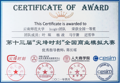 4月8日至4月11日,由芬兰“尖烽时刻”中国区组委会主办,中国人民大学承办的第十三届“尖烽时刻”全国商业模拟大赛总决赛在北京通过线上的方式举行。我院2020级MPAcc(会计硕士专业学位研究生)叶琛、杨政、马宇箫、迟雪华组成的“Insight”代表队与北京师范大学、厦门大学、南开大学等知名高校团队同台竞技,经过4天激烈角逐,最终获得全国一等奖、英文展示奖(尖烽巧克力奖)。