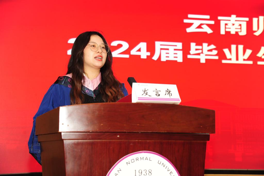 在毕业生代表发言环节中, 2021级龚成琳同学、关鸿雁同学分别讲述了自己读研的初衷以及研究生期间的收获,对母校的培养和老师们的谆谆教诲表达了感谢,大家表示要做志存高远、脚踏实地、有历史责任感的时代新人。