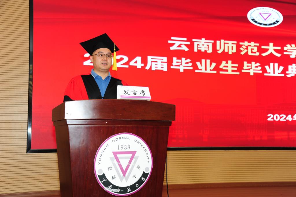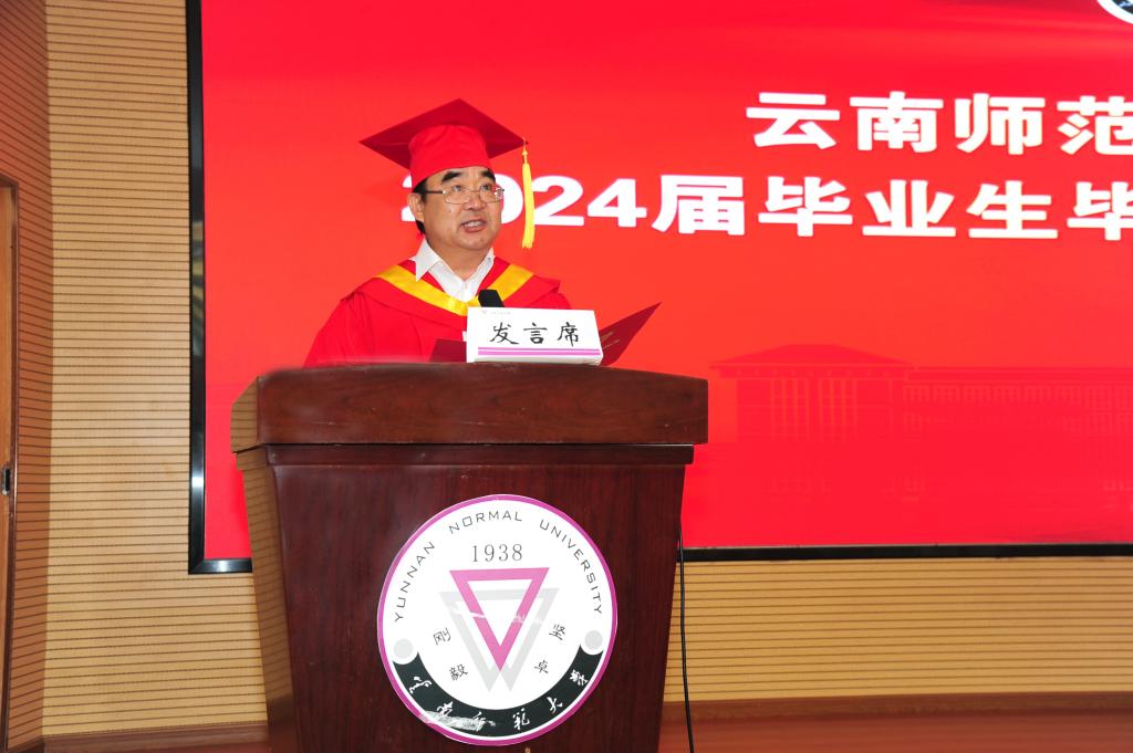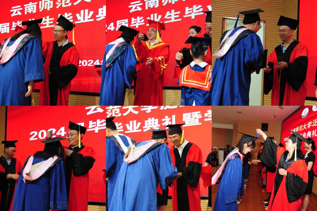 在典礼开始前,通过一段视频,全体师生一起回顾了在校期间的学习生活。屏幕上闪过的一幅幅教学场景和活动画面,“民主草坪”上的欢声笑语,红烛路的灯光,学汇苑的夜话,明达楼的课堂,记录着毕业生们在云师大度过的美好时光,见证着毕业生们在研究生生涯里的蜕变和成长。