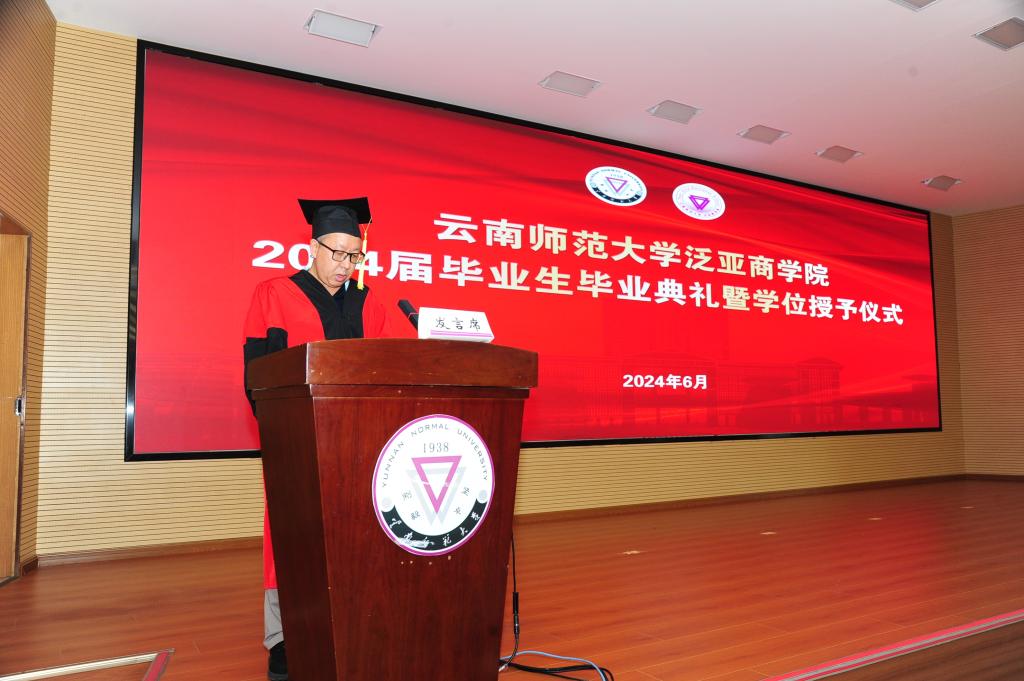 2024年6月29日,泛亚商学院2024届毕业生毕业典礼暨学位授予仪式在一二一校区田家炳报告厅举行。副校长、MBA教育中心主任武友德,研究生院院长骆华松,学院全体领导班子成员、研究生导师、教师,2024届160名毕业生代表及家人参加了典礼。典礼由学院党委副书记范庆江主持。