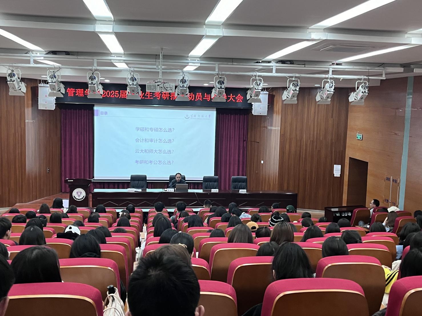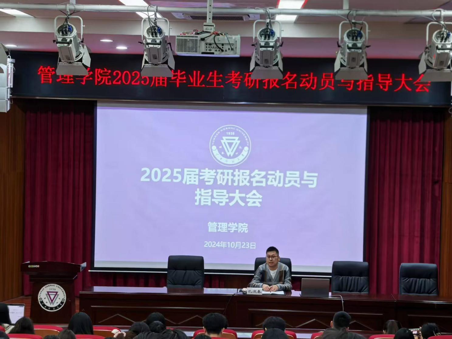 为全面助力2025届学生明确考研目标,合理选定院校,激发考研自信心与积极性,10月23日中午,管理学院在明德1号楼101报告厅召开“2025届考研报名动员与指导大会”。学院党委副书记孔迎春、全体毕业班班主任、辅导员及2021级毕业生参加会议。