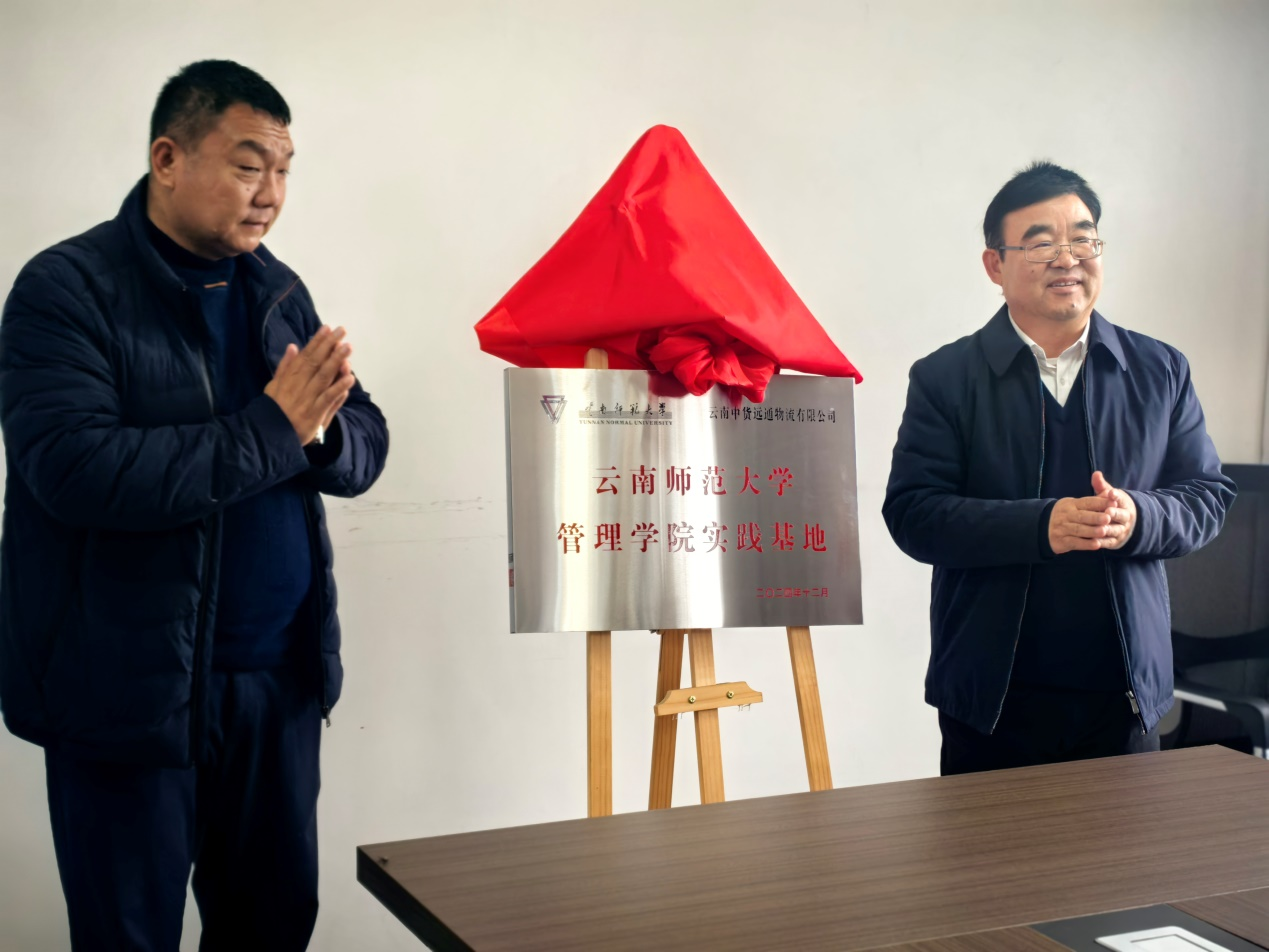 签约仪式上,武友德副校长与沈贵有董事长为“云南师范大学管理学院实践基地”揭牌,李正升书记、沈贵有董事长分别代表云南师范大学管理学院和云南中货远通物流有限公司签署共建实践基地合作协议。