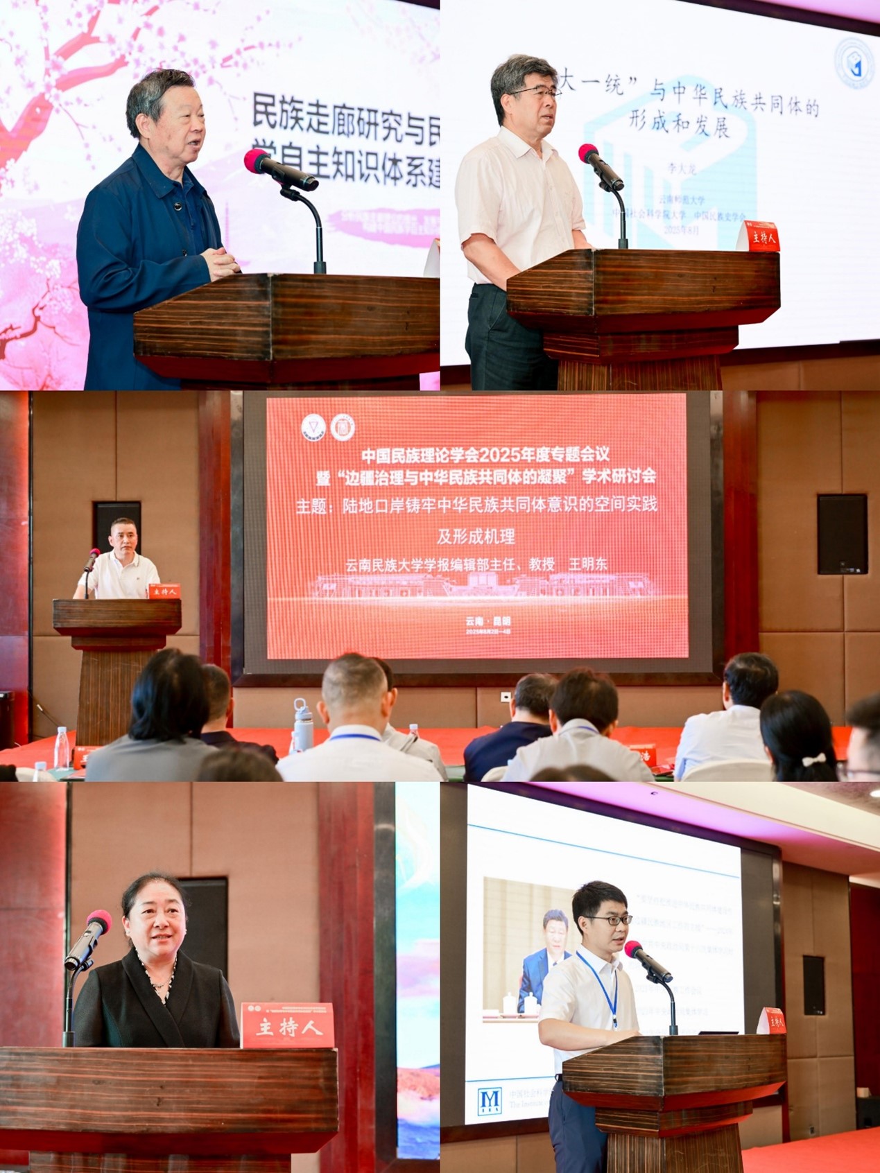 会议主旨报告环节内容丰富、视野开阔、观点鲜明。中国民族理论学会会长王延中研究员以“准确把握铸牢中华民族共同体意识的主线定位”为题作线上发言,强调构建中华民族现代文明的主线逻辑。中央民族大学关凯教授以“第二个结合”为切入点,深入探讨了新时代民族理论的创新路径;王德强教授从制度视角分析了香格里拉松茸产业中的族际互动及社会治理实践;周大鸣教授、李大龙教授、李若青书记、王明东教授、张少春研究员分别围绕民族走廊研究、“大一统”思想的历史价值、云南省的治理实践实践经验、陆地口岸的空间治理机制、共同体建设的理论基础等重要题作了主旨报告,充分展现了当前民族理论研究的学术深度和广阔前景。