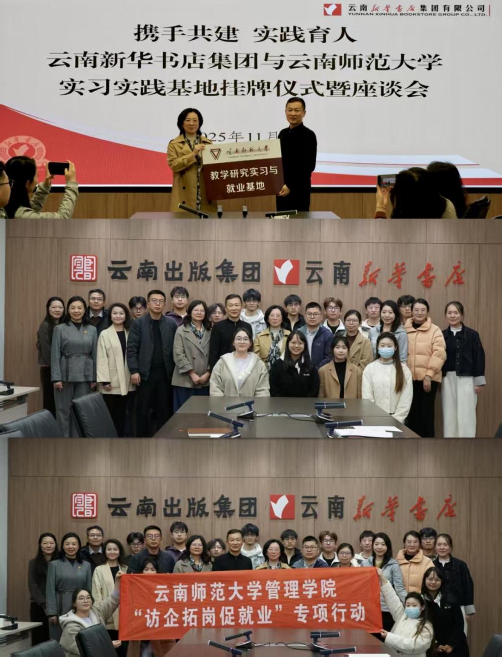 11月4日,学院与云南新华书店集团在云南新华书店集团总部举行了实习实践基地挂牌仪式暨座谈会。云南新华书店集团党委副书记、总经理唐庆,党委委员、副总经理虞跃等相关领导,云南师范大学管理学院院长李艳、党委副书记孔迎春、副院长周宁等相关院领导、老师及10余位同学出席了仪式及座谈会。