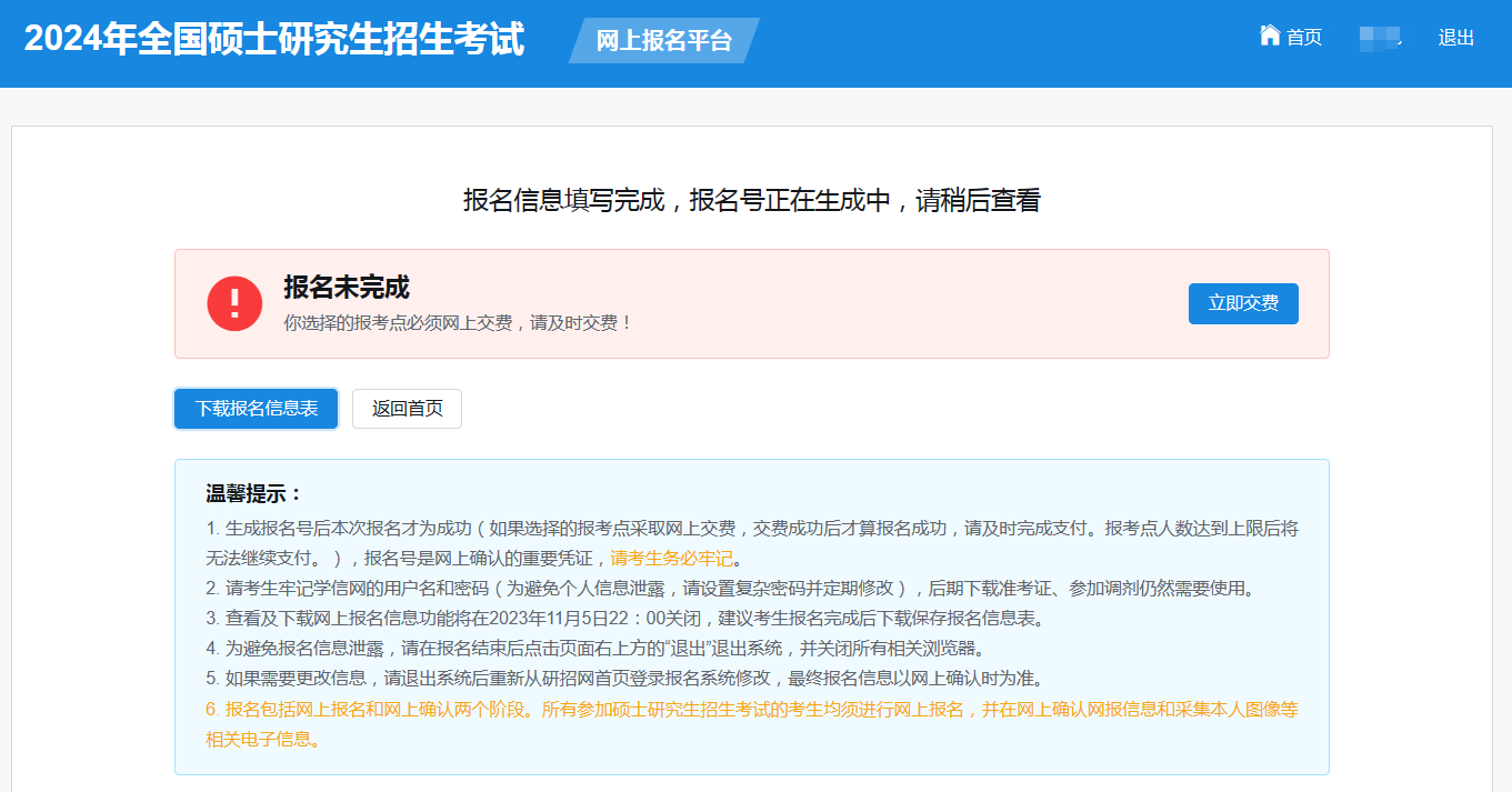 查看及下载网上报名信息功能将在2023年11月5日22:00关闭,建议考生报名完成后下载保存报名信息表。且考生未按要求,错选报考点、报考单位、考试方式等,需在网上报名截止时间前重新报名,并按省级管理部门要求交费,逾期亦不再补报。