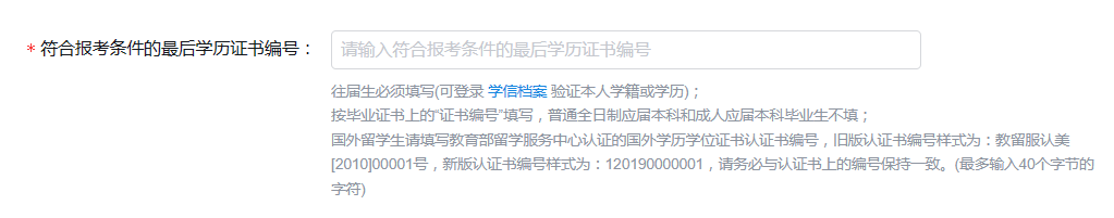 8.毕业证书编号请填写16位或18位电子注册号或者学校编号,若毕业证书上没有16或18位数字编号,则填写证书上其他数字编号;若有学位证书,请将学位证书编号也填写准确。毕业证书编号若只显示一个编号,则填写该编号;若显示两个编号,则填写“学校编号”项。
