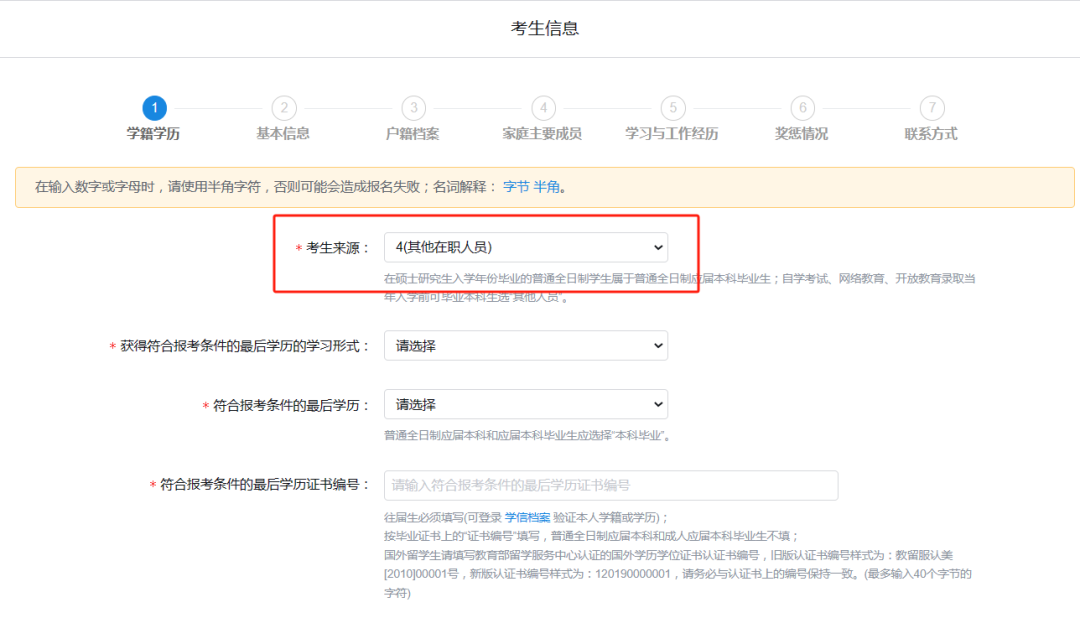 7.学籍学历信息中“考生来源”一般为“4其他在职人员”。