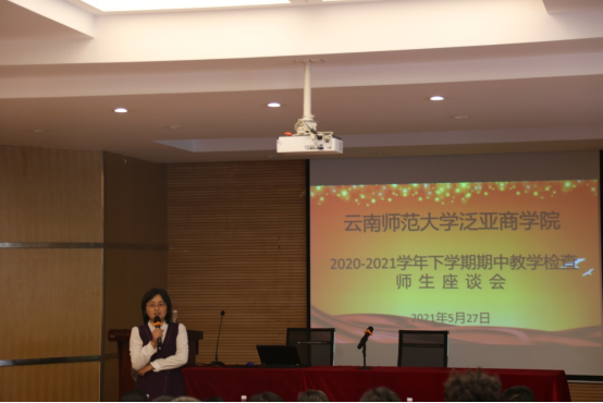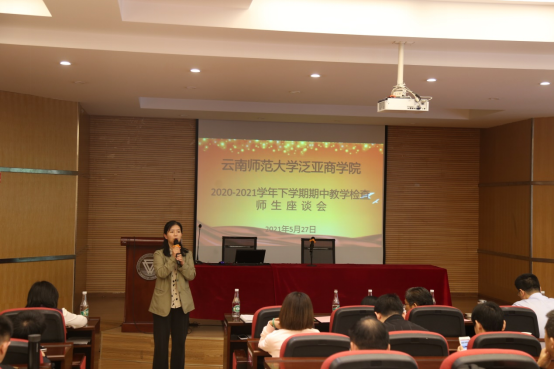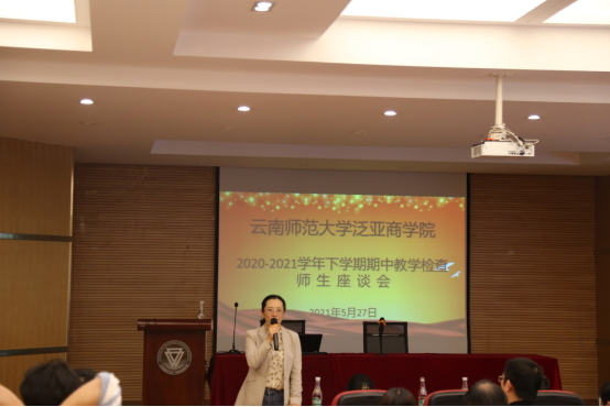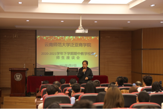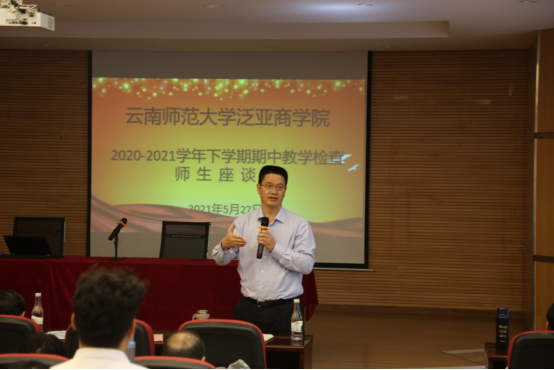 为进一步加强我院教学规范化管理和教学质量监控,根据学校党史学习教育关于“我为群众办实事”的相关要求,按照学院整体教学工作安排,我院于2021年5月27日下午在学院106教室召开了期中教学检查暨征求意见师生座谈会,参与座谈会的有我院和向朝书记、李正彪院长、李艳副院长、周宁副书记、金融系李丽主任、工商管理系张晓磊主任、检查小组成员、各专业任课老师、各班班主任、教务办老师以及20级全日制全体研究生,本次会议由教务办郭秋平老师全程主持。