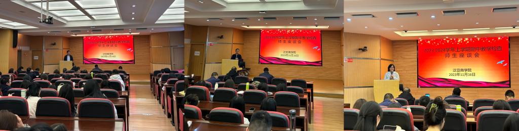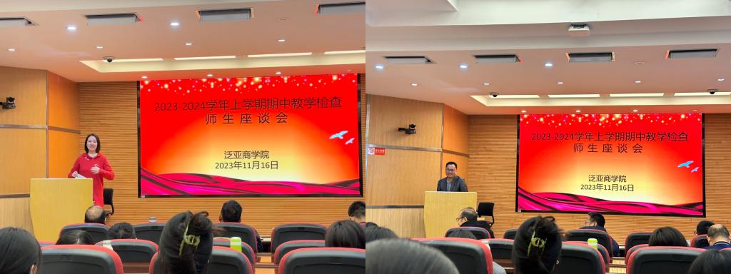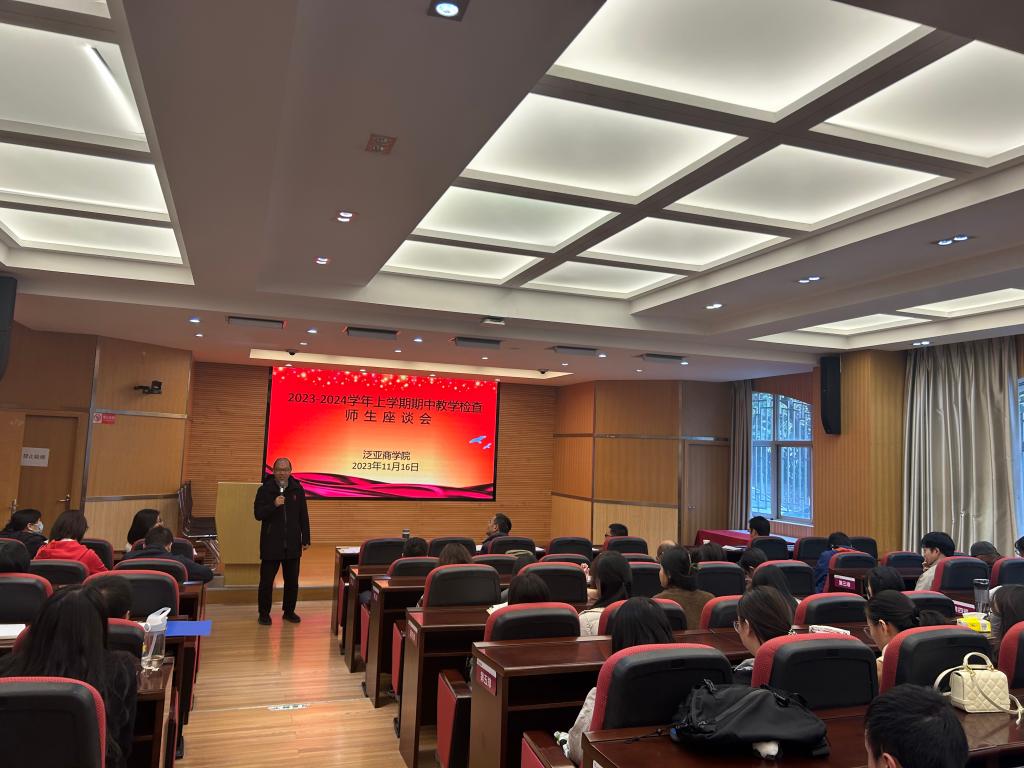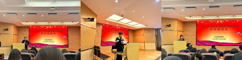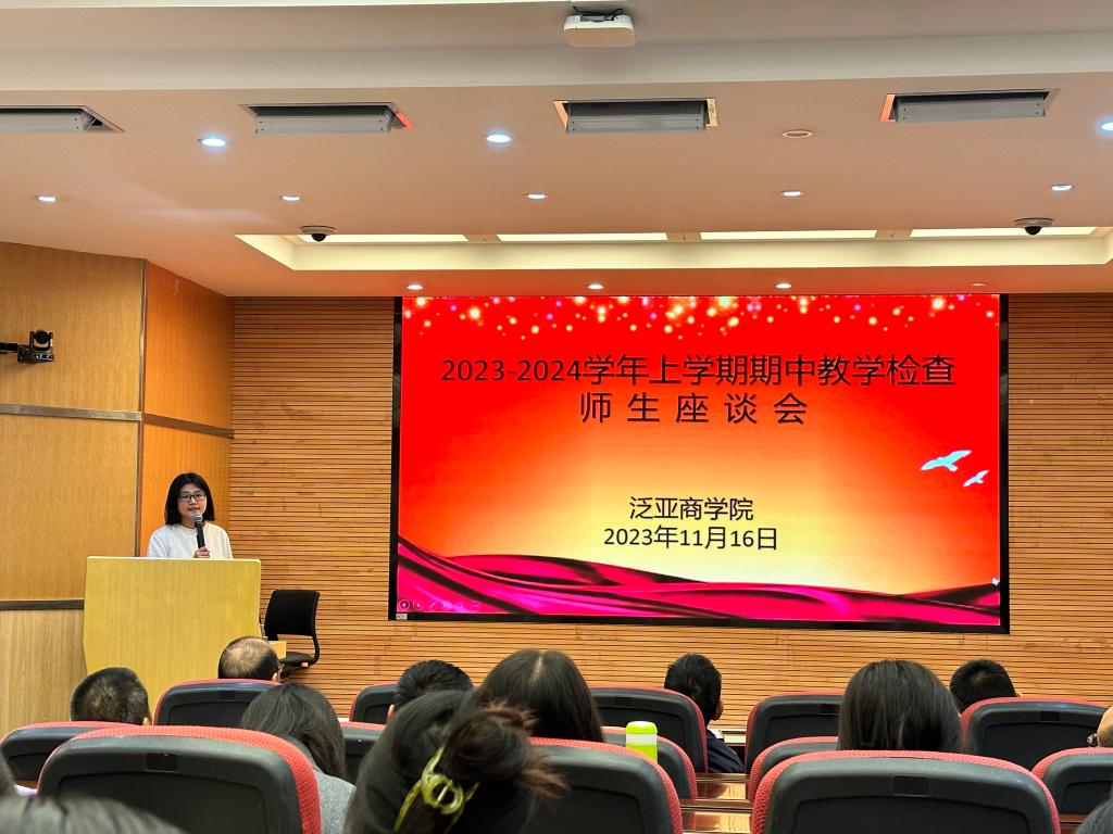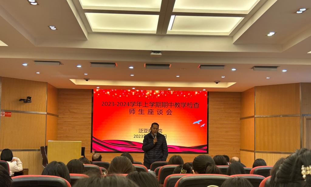 为进一步规范教学秩序、加强教学管理,学院于2023年11月16日下午在106报告厅举行了期中教学检查师生座谈会。泛亚商学院李明副院长、教学督导蒋文江教授、检查小组其他成员、本学期任课教师、教务办、学生办老师以及研究生代表参加了本次会议。会议由教务办赵文君老师主持。