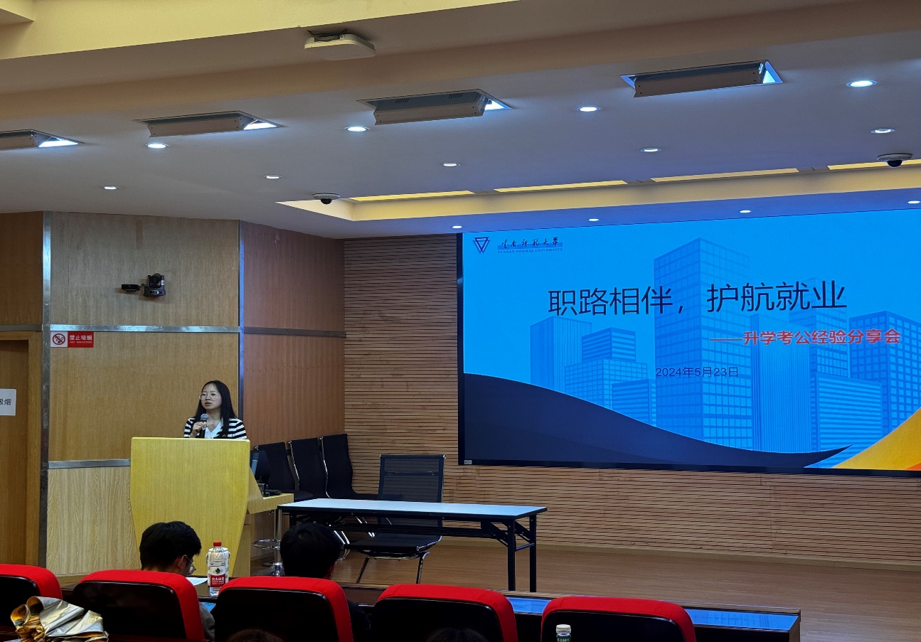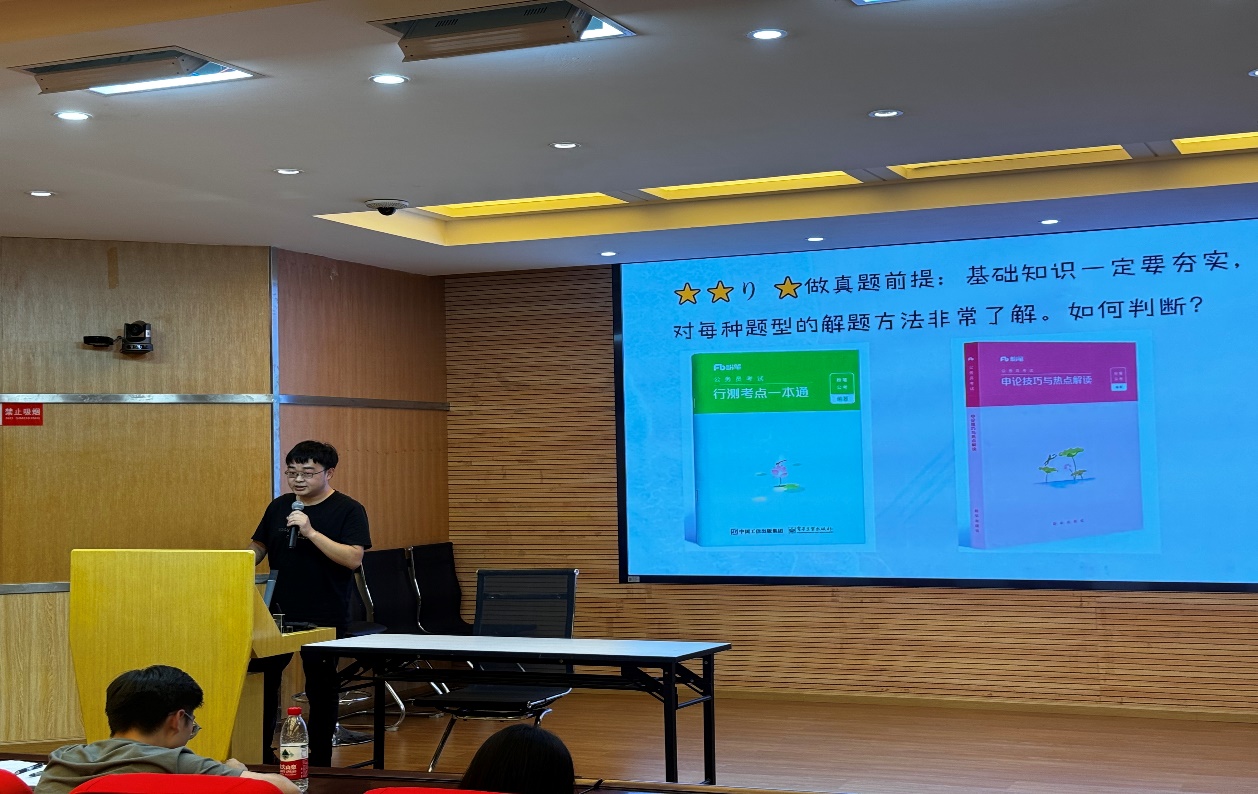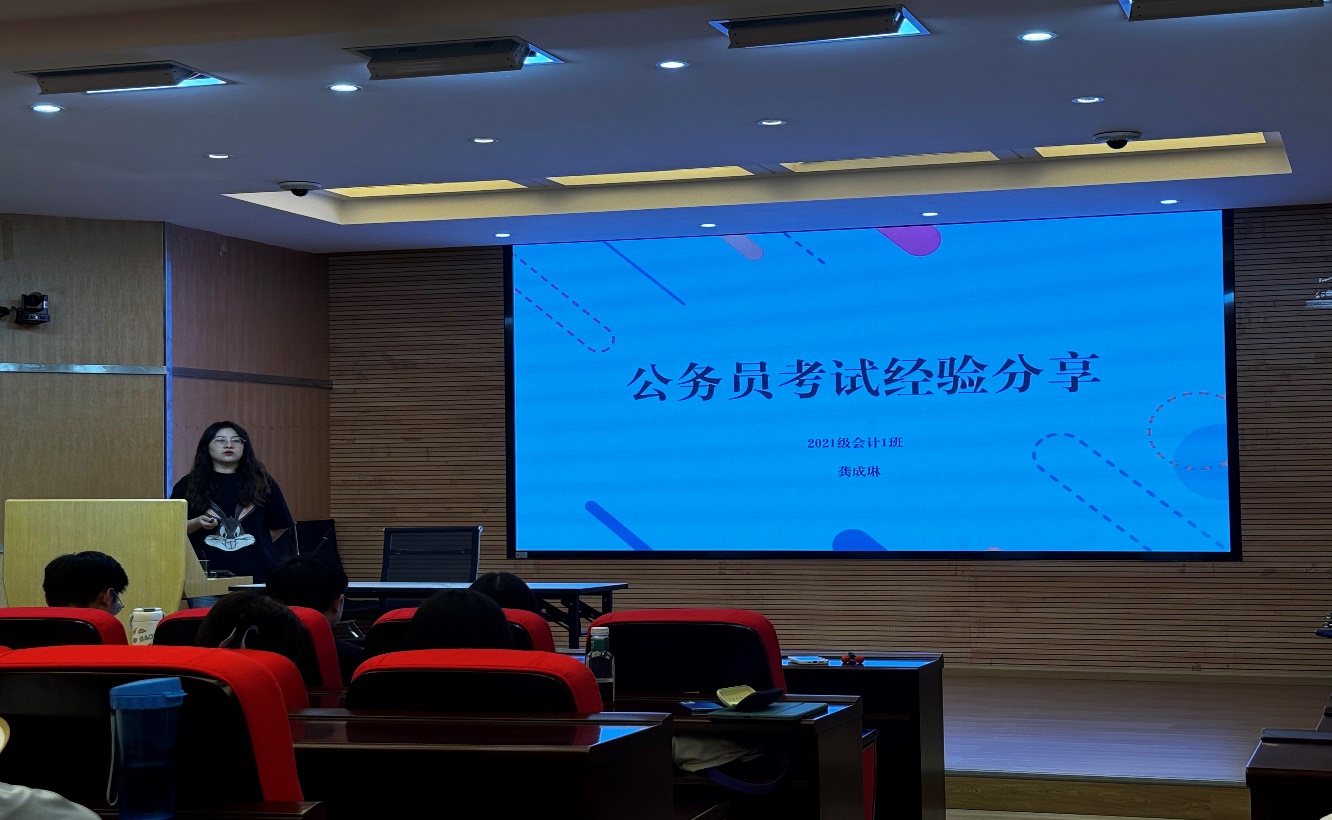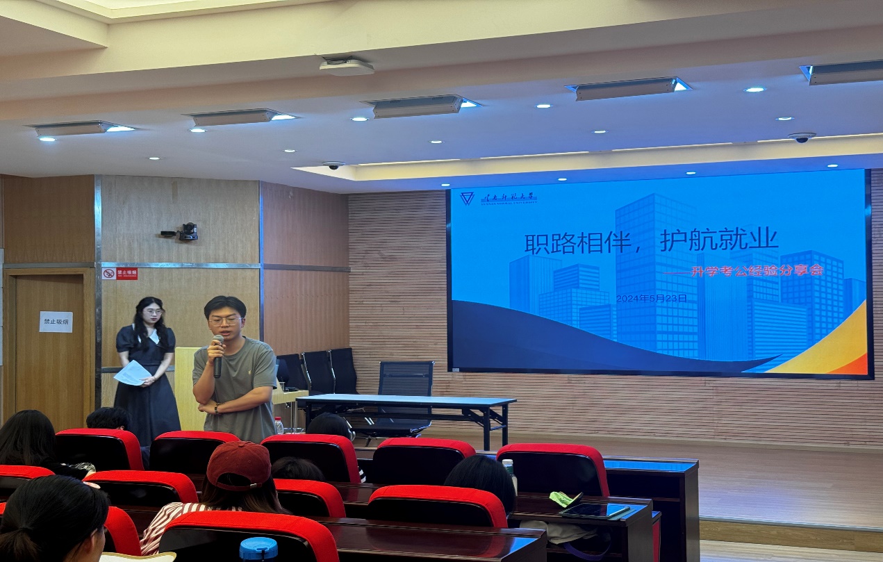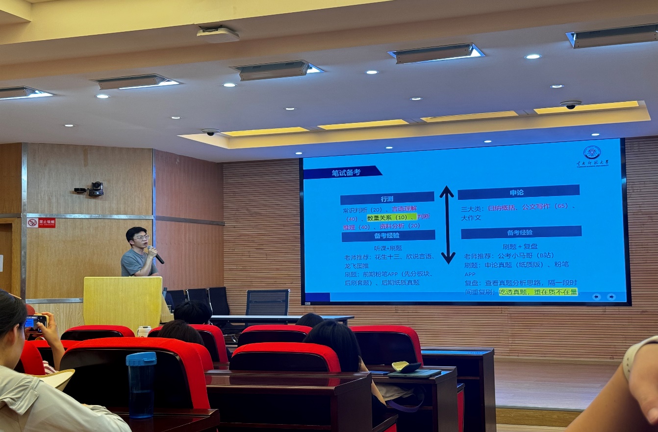 为激励广大学生树立正确的就业观、择业观,提升未来就业竞争力,5月23日下午15:30,学院在明达楼106报告厅举行升学、考公经验分享交流活动。本次活动共邀请了2024届毕业班六位同学分别交流公务员备考、升学等方面的经验和技巧,共有100余名在校学生参加了本次活动。