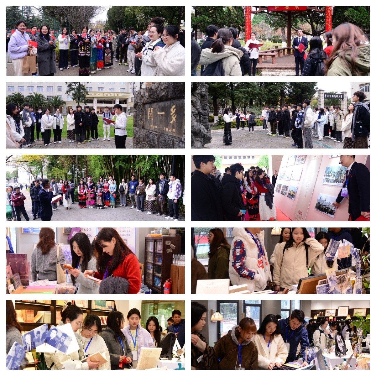 在讲解员郭宜翀同学的带领下,大家沿着中大路、三校亭、闻一多像、一二·一运动广场、西南联大纪念碑、九三阅兵摄影展、历史建筑等有序参观,尤其在闻一多像前,师生们聆听了一场专题思政课,让香港青年沉浸式感受云南师范大学厚重的历史底蕴,深刻体悟“刚毅坚卓”的精神内核。