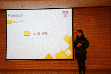 第二个环节是压力问答环节,选手随机抽取1个题目,再由面试官根据选手的自我介绍提1个问题,这一环节充分考验了选手的反应及思辨能力,选手们巧妙的回答博得了阵阵掌声,展现了参赛同学的个人风采和青春的朝气。