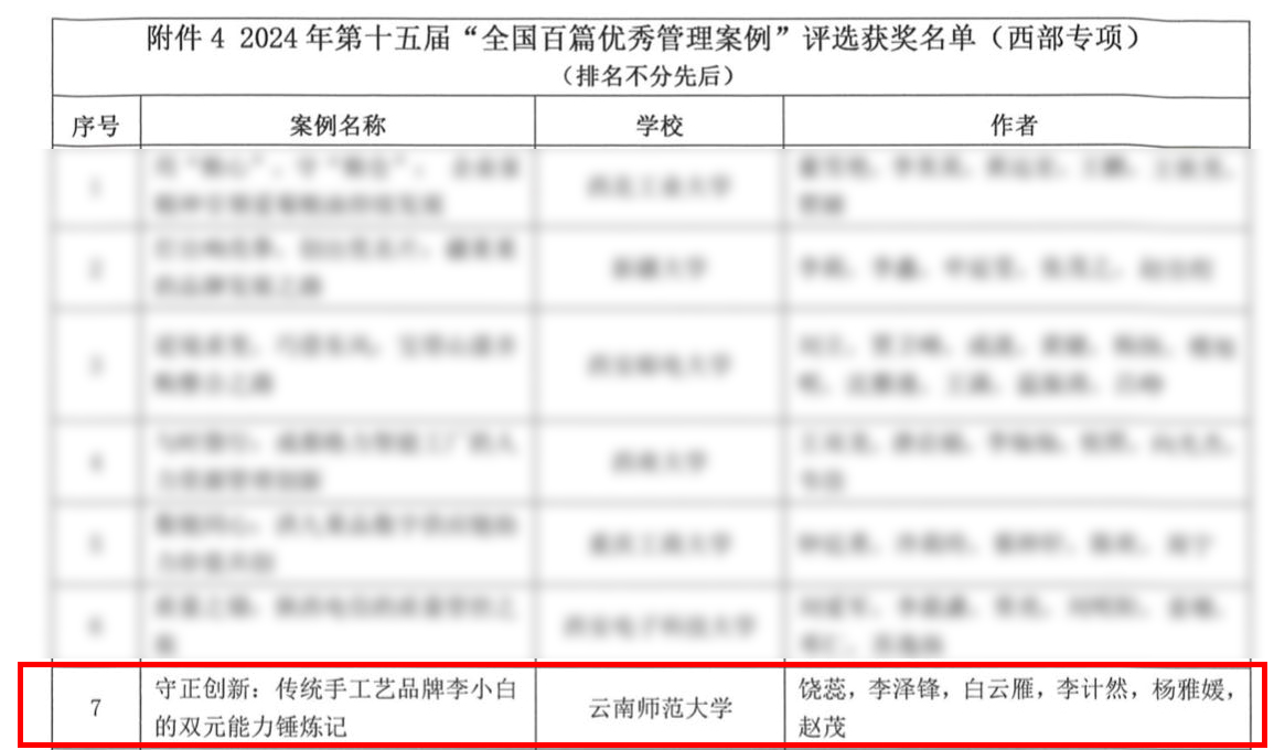 2024年9月9日,在全国工商管理专业学位研究生教育指导委员会的指导下,中国管理案例共享中心发布了第十五届“全国百篇优秀管理案例”的获奖名单。本届国家优秀管理案例的评选,共有来自全国各高校的1512 篇案例参评。经过同行专家的匿名函审和专家委员会组织的会评等两轮严格的评审工作,由我校管理学院李艳老师指导、饶蕊老师团队完成的《守正创新:传统手工艺品牌李小白的双元能力锤炼记》项目从中脱颖而出,获得本届“全国百篇优秀管理案例奖”。