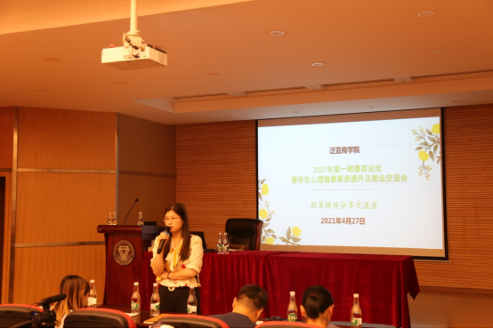2021年4月27日,我院在明达楼106报告厅举行2021年第一期菁英论坛暨学生心理健康素质提升及就业交流会。此次交流会邀请到我院2019级非全日制MBA集中班八位同学作为分享嘉宾。讲座旨在通过我院非全日制学生与全日制学生的交流,结合朋辈榜样的自身经历,以零距离互动交流形式,帮助在校学生处理好环境适应、人际交往、求职就业等方面压力,同时丰富校园文化,营造有利于学生心理健康的校园氛围 。