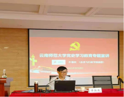 邀请学校党史学习教育教师宣讲团成员——云南师范大学历史与行政学院许新民教授为全体教师进行宣讲。许新民教授从“深入学习领会习近平总书记关于党的历史的重要讲述,充分认识开展党史学习教育的重大意义”、“认真研读党史基本著作,全面了解中国共产党百年奋斗的光辉历程和历史性贡献”、“深刻把握开展党史学习教育的重点”、“学懂弄通做实习近平新时代中国特色社会主义思想,增强‘四个意识’、坚定‘四个自信’、做到‘两个维护’”、“从百年党史中汲取奋进新征程的强大力量,为云南开创全面建设社会主义现代化新局面不懈奋斗”五个方面进行了讲解。